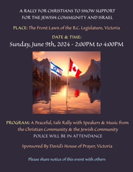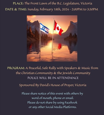 - Feb 18th Sunday - Front Lawn of BC Legislature, Victoria 2:00pm to 3:30pm: Peaceful Rally with music and speakers from the Christian and Jewish community.